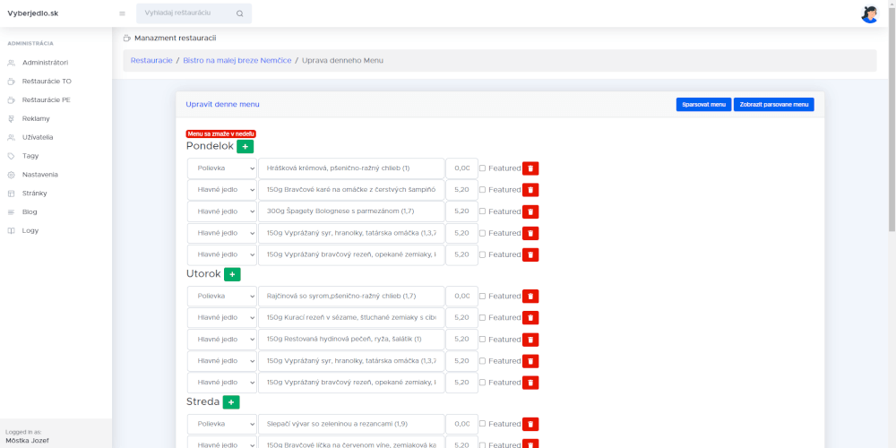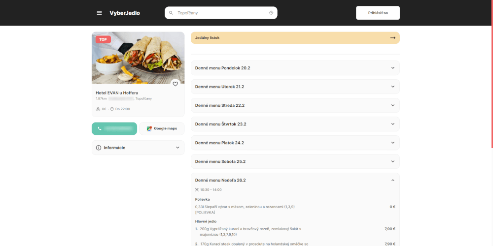 Zoznam reštaurácií, ich ponuka denného menu, vyhľadávanie cez Google API, OAuth prihlasovanie a pridávanie reštaurácii do obľúbených.